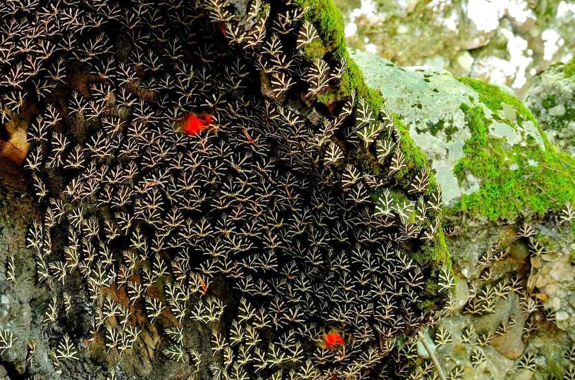 The habitat is the summer refuge of the butterfly with the scientific name Panaxia Quadripunctaria. The butterfly rests on tree trunks and rocks during the day. Resting, it has the shape of an equilateral triangle. Its forewings are black-brown in color with white-yellow streaks. Her hind wings are red with four black spots. It feeds on nectar and water. In “Petaloudes” the butterfly appears in mid-June and migrates in late September.