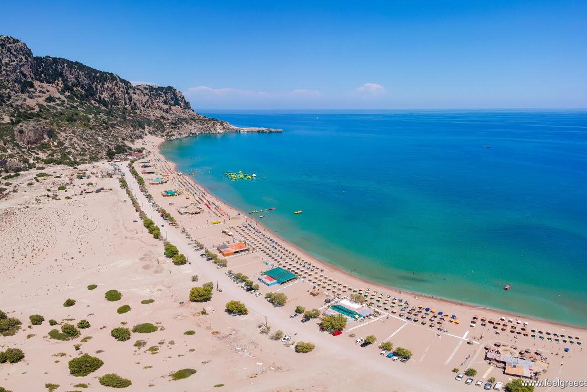 Tsambika beach is long and broad with fine, golden sand and dozens of colourful little flags marking out the various eating establishments and beach sports centers. Tsambika is one of the most beautiful beaches on Rhodes.